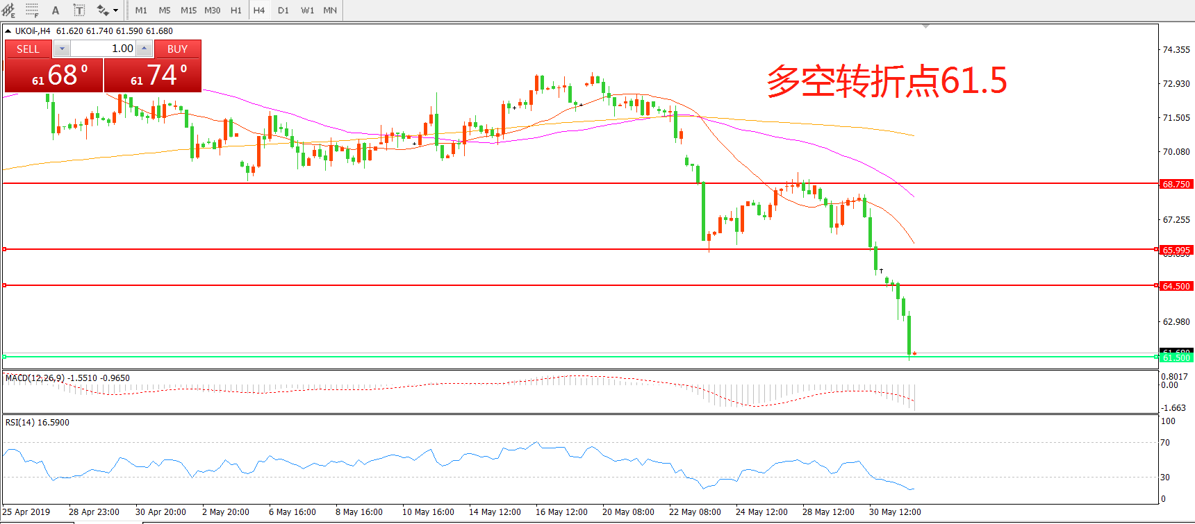 4小时图看,油价长阴下破,偏空走势明显,MACD绿柱增加,均线系统呈空头排列,日内延续下行概率较大