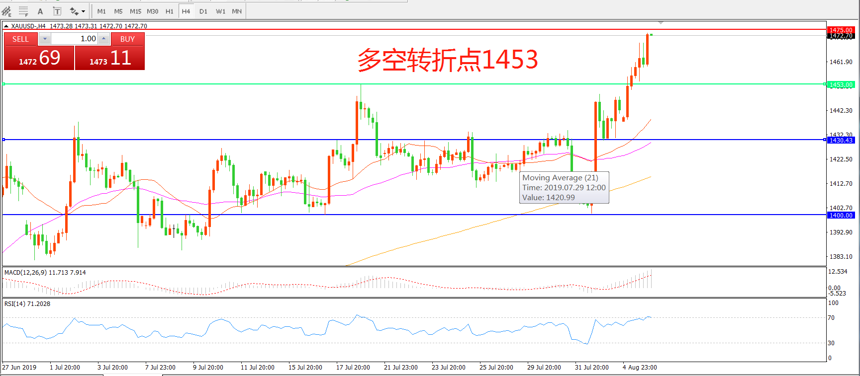 交易策略:在1453.00之上看涨,目标1475.00 1500.00