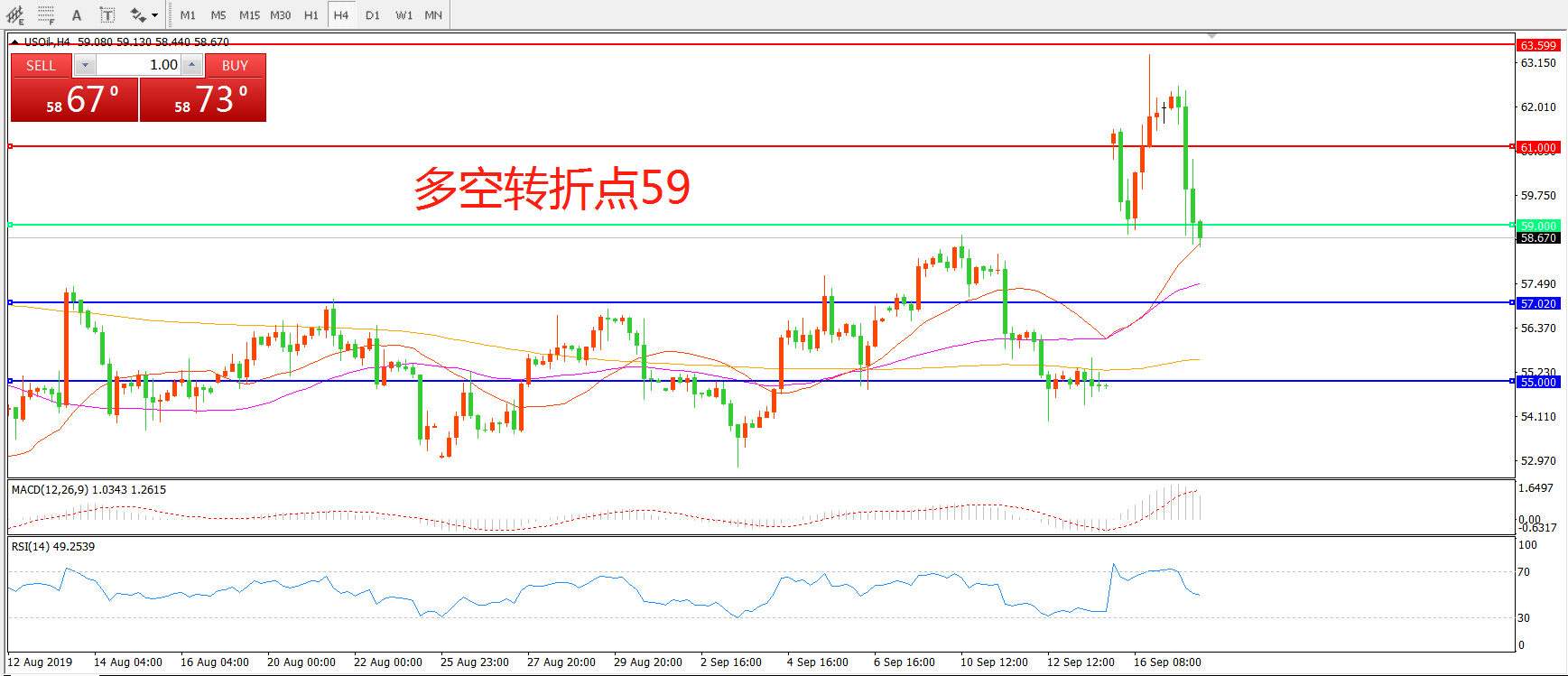 4小时图看,油价受消息面影响阴线连续下挫,前期涨幅基本被吞没,但整体仍在前期区间之上,59美金成为短期多空分水岭,均线系统依然呈多头排列,MACD红柱减少,RSI指标向下,日内延续震荡概率较大。
