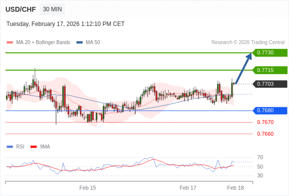 在 0.7680 之上,看涨,目标价位为 0.7715 ,然后为 0.7730 。