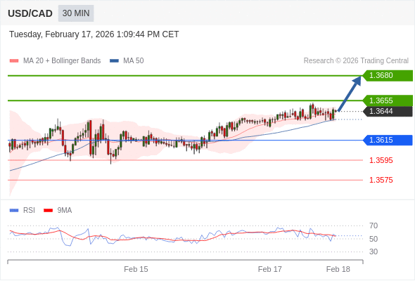 在 1.3615 之上,看涨,目标价位为 1.3655 ,然后为 1.3680 。