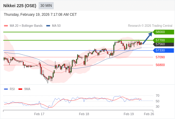在 57330 之上,看涨,目标价位为 57700 ,然后为 58000 。