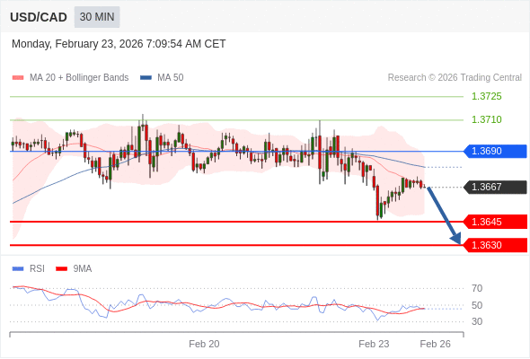 在 1.3690 之下,看跌,目标价位为 1.3645 ,然后为 1.3630 。