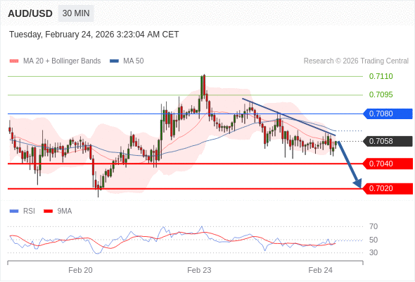 交易策略: 在 0.7080 之下,看跌,目标价位为 0.7040 ,然后为 0.7020 。