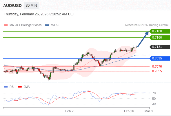 在 0.7095 之上,看涨,目标价位为 0.7160 ,然后为 0.7180 。