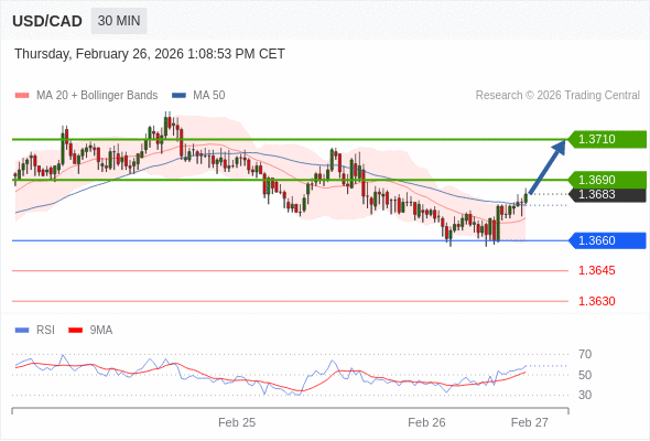 在 1.3660 之上,看涨,目标价位为 1.3690 ,然后为 1.3710 。
