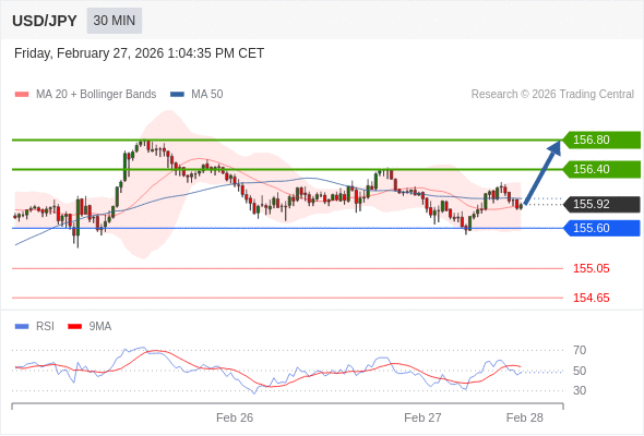 在 155.60 之上,看涨,目标价位为 156.40 ,然后为 156.80 。