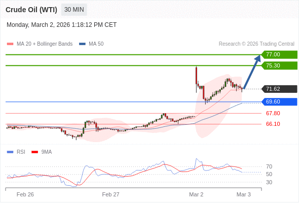 在 69.60 之上,看涨,目标价位为 75.30 ,然后为 77.00 。