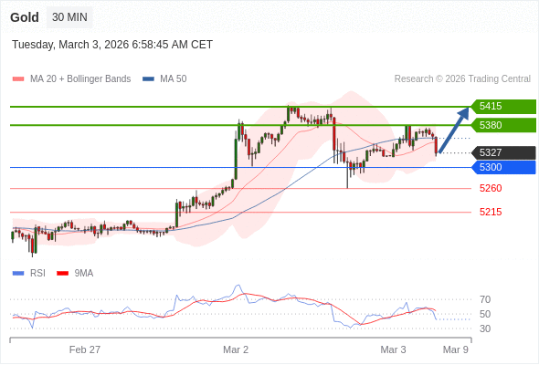 交易策略: 在 5300 之上,看涨,目标价位为 5380 ,然后为 5415 。