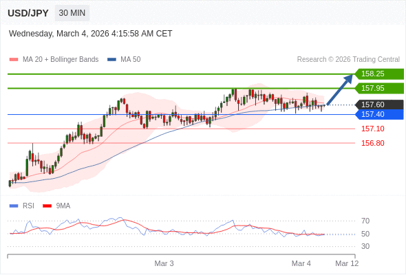在 157.40 之上,看涨,目标价位为 157.95 ,然后为 158.25 。