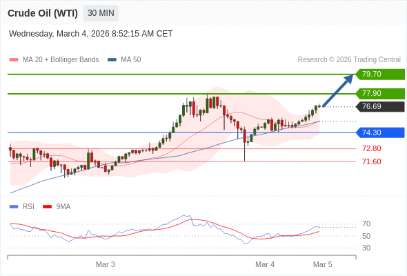 在 74.30 之上,看涨,目标价位为 77.90 ,然后为 79.70 。