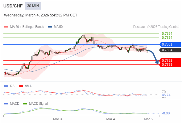 美元/瑞郎 当日内 : 看跌,在 0.7831 之下。