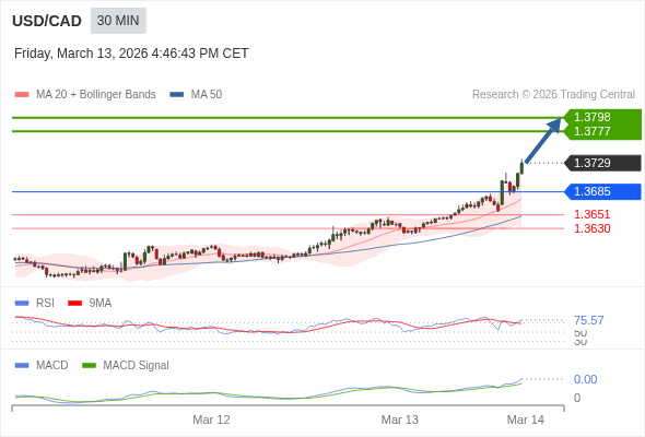 美元/加元 当日内 : RSI是超买的