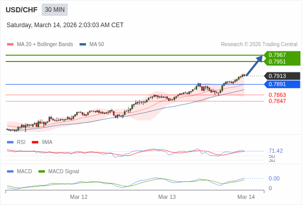 美元/瑞郎 当日内 : 看涨,当 0.7891 为支撑位。