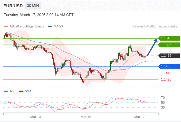 在 1.1460 之上,看涨,目标价位为 1.1525 ,然后为 1.1545 。
