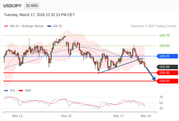 在 159.25 之下,看跌,目标价位为 158.85 ,然后为 158.65 。