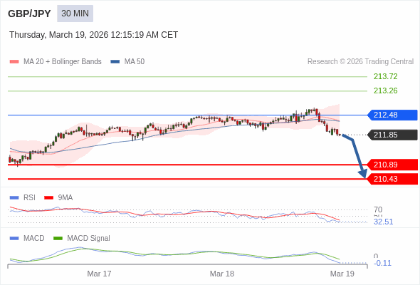 英镑/日元 当日内 : 看跌,在 212.48 之下。