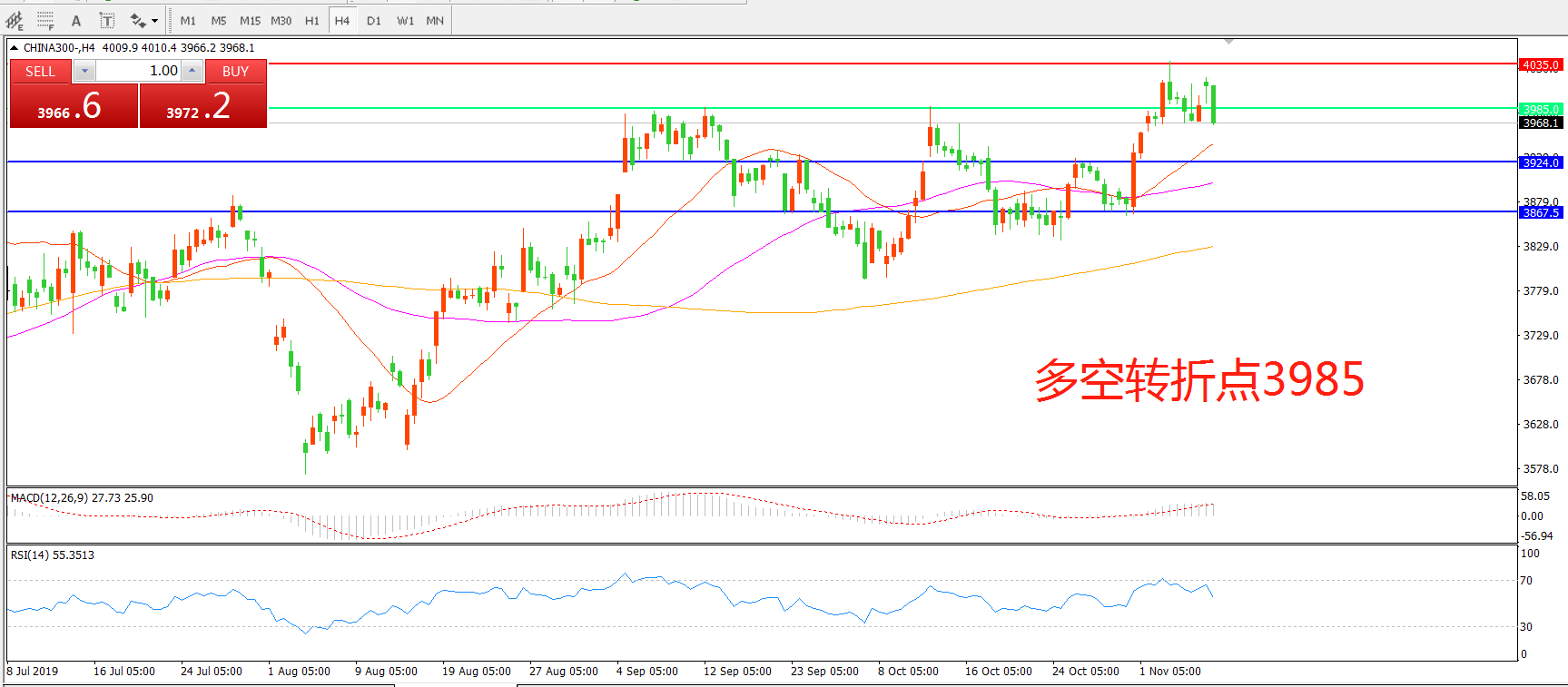 4小时图看,沪深300触碰4035阻力后震荡回落,整体维持高位震荡走势,均线系统有拐头迹象,MACD红柱增加,RSI指标向下,日内延续上行概率较大。