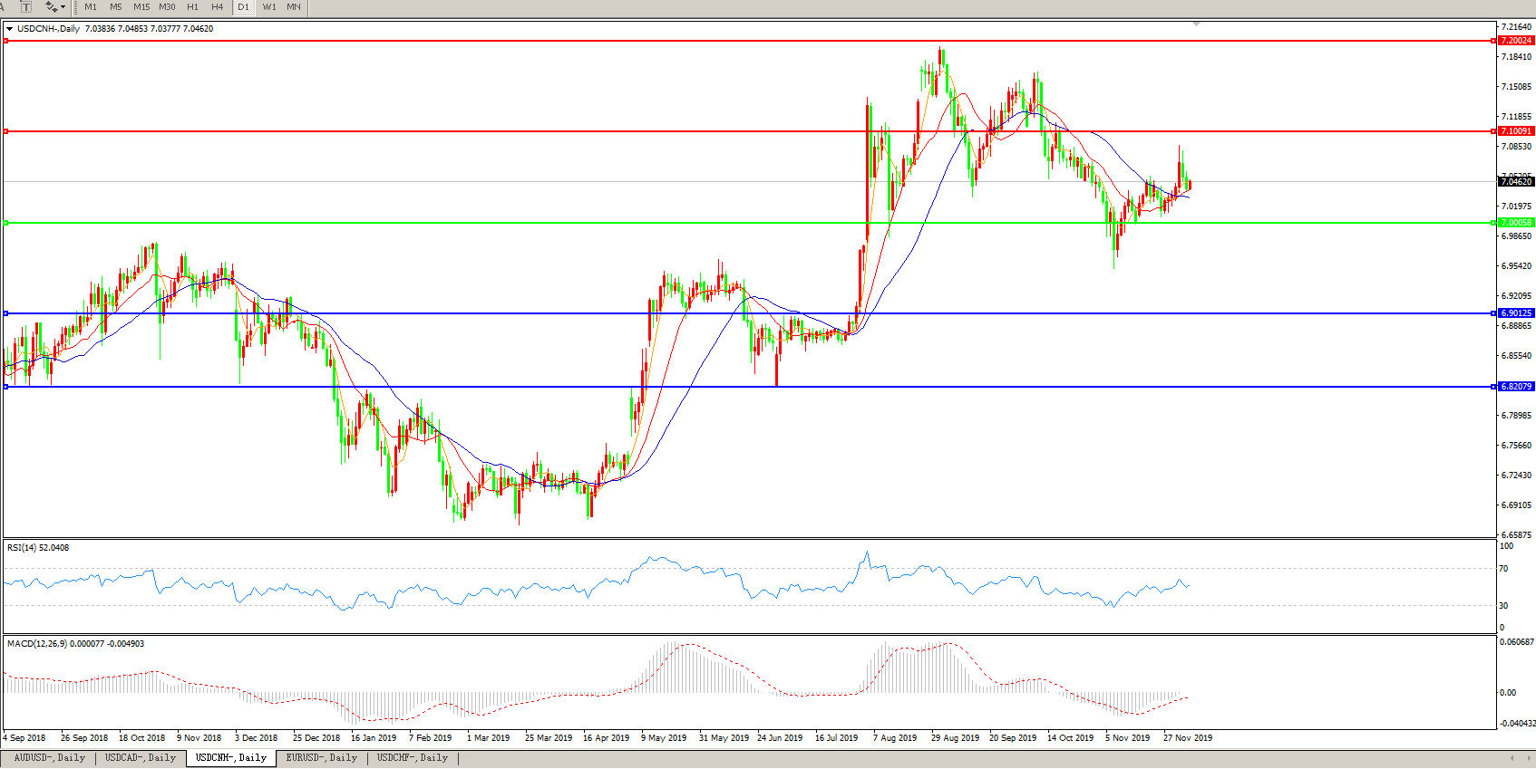 技术面简析:日图均线开始发散上攻,汇价近期攻势逐步缓和,MACD运行于0轴下方但量能不足,RSI整理中走低,预计短期汇价将在7.0关口附近整理,中期汇价需等待美元指数及中美贸易谈判最新进展指引。