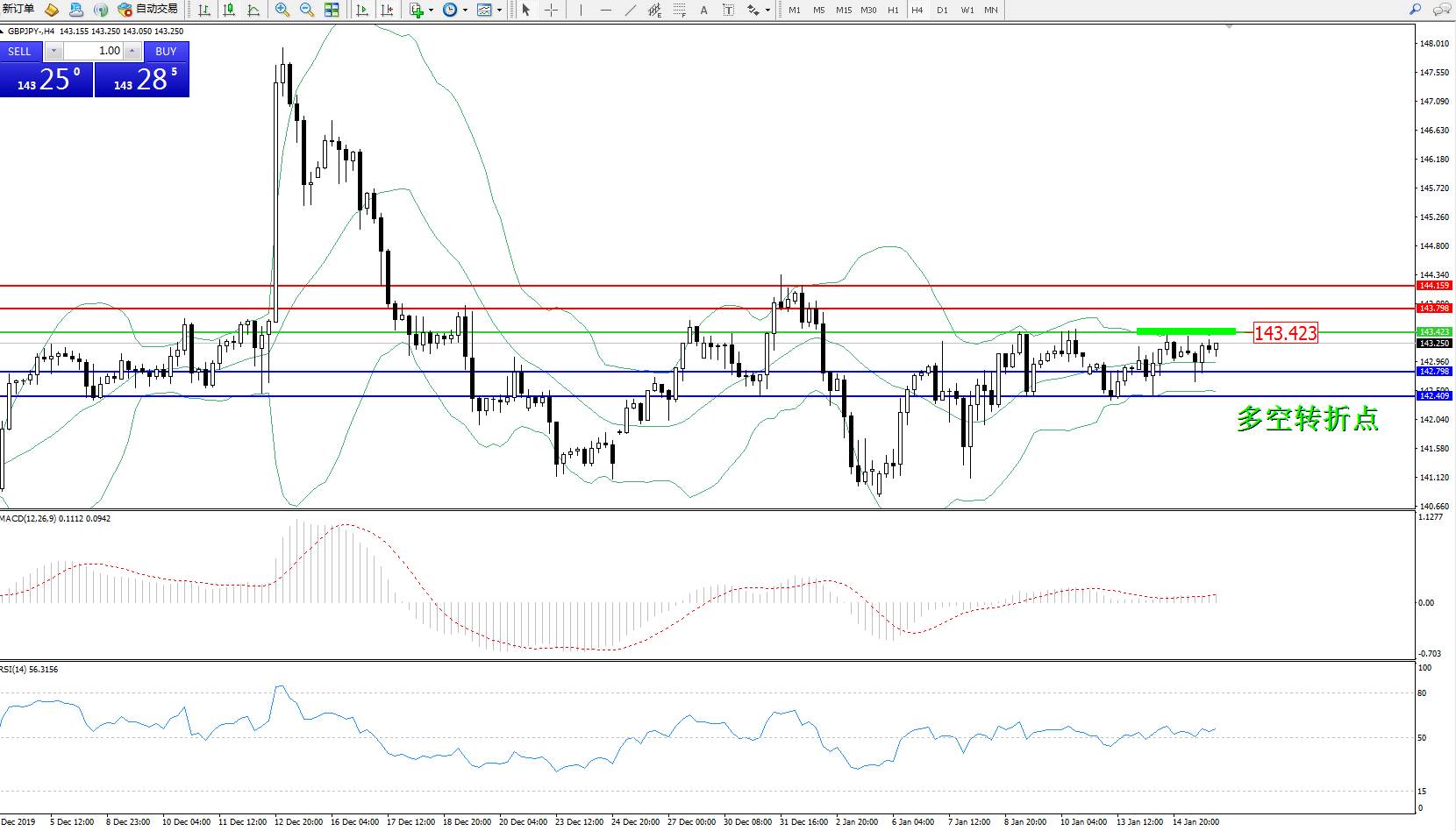 交易策略:143.423下方看跌,目标142.798142.409