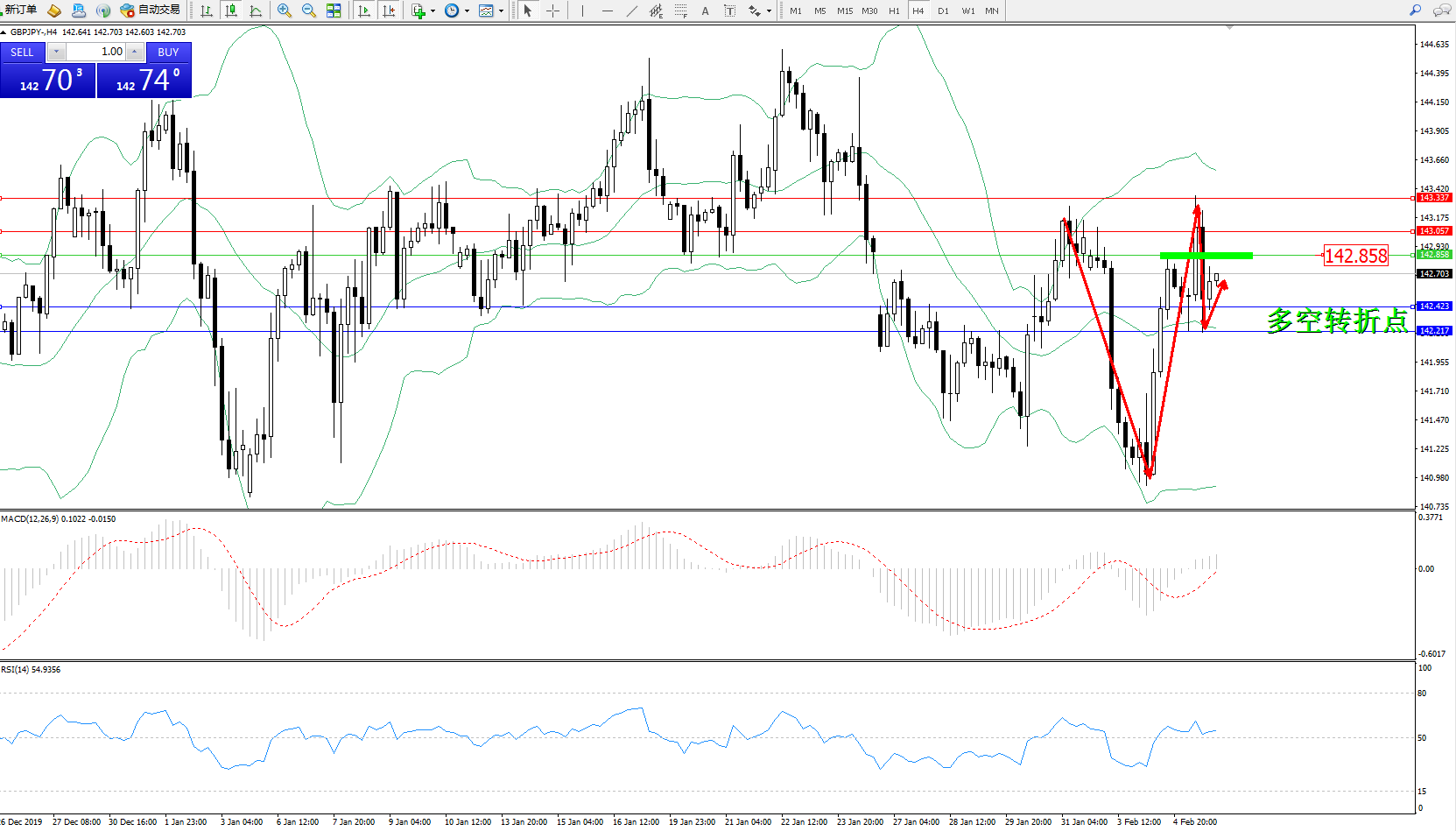 交易策略:142.858下方看跌,目标142.423、142.217