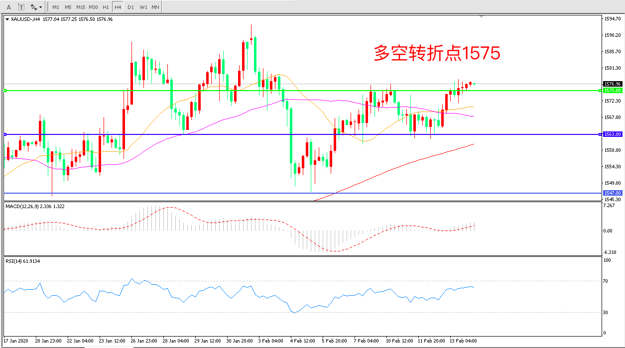 4小时图看,金价震荡走高,突破1575一线,上行动力较强,均线系统走平, MACD红柱增加,RSI指标走平,日内延续上行概率较大。