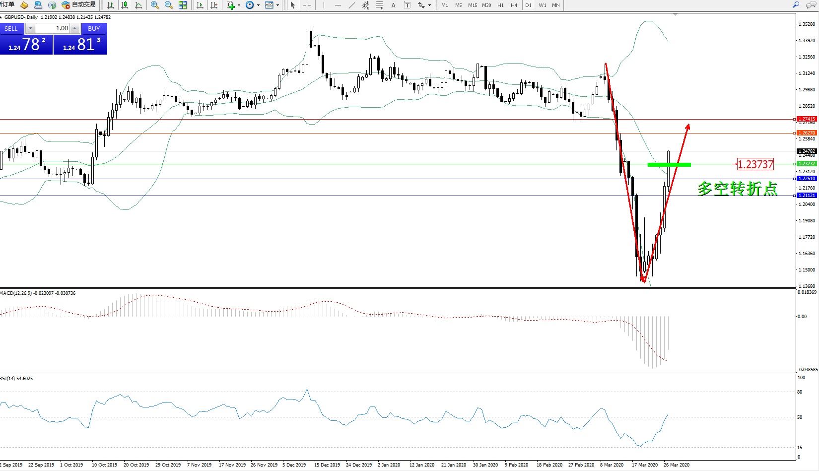 交易策略:1.23737上方看涨,目标1.26270、1.27415