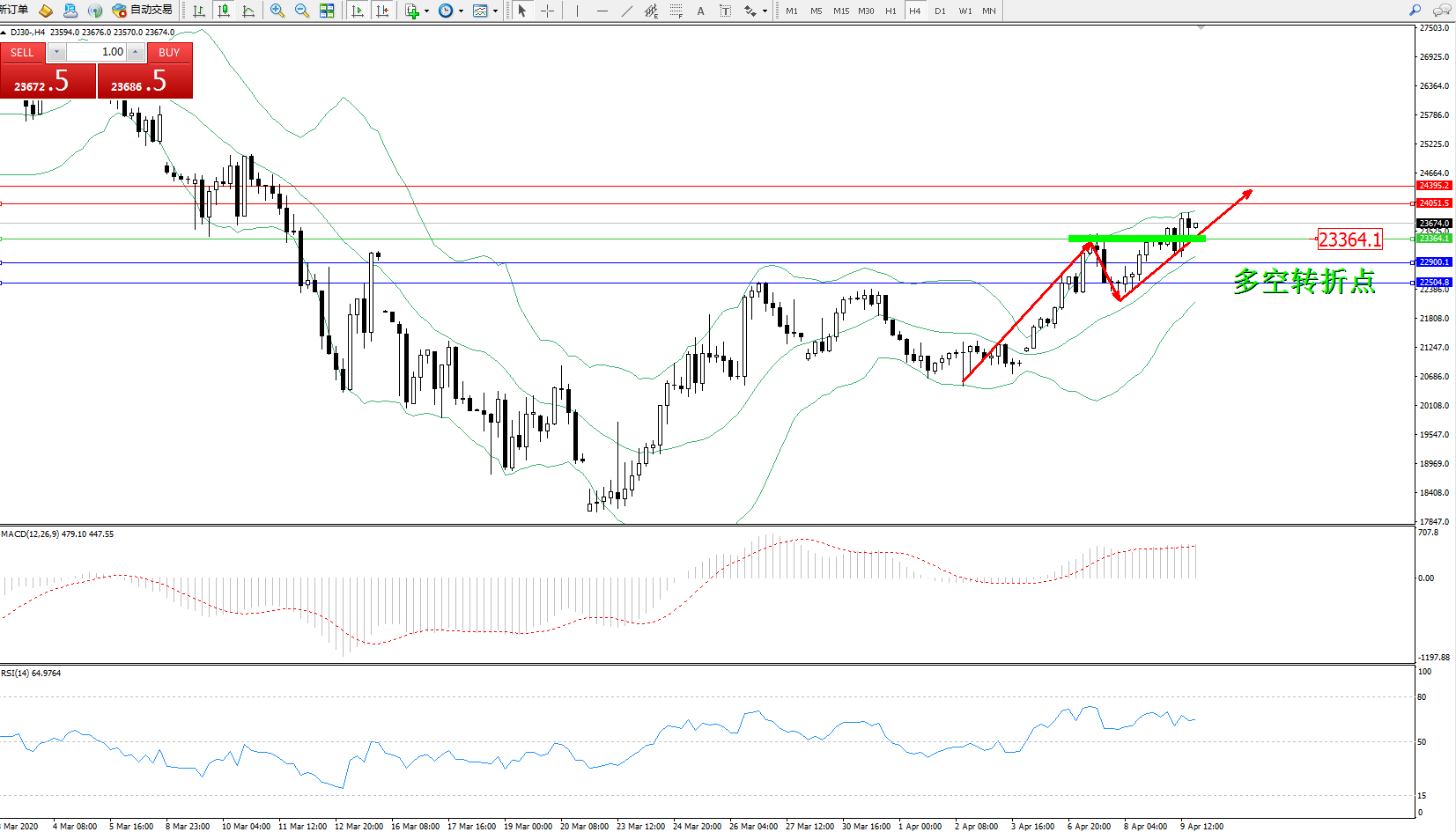 道琼斯指数4月9日(周四)收盘上涨285.80点,涨幅1.22%,报23719.37点。美国股市创出了自1974年以来的最大单周涨幅,美联储出台了缓解冠状病毒影响的一系列新措施,令投资者忽略了惊人的失业数字。美联储日内表示将提供多达2.3万亿美元的额外援助,以减轻新冠疫情的影响,且报告显示美国首次申领失业救济人数持续激增。在经济遭受重创的地区,新冠疫情或接近见顶,拉低对避险美元的需求。美联储的大胆努力帮助抵消了就业市场上更可怕的消息。美联储今天的强有力行动突显了其拥有的无限火力,这在一定程度上有助于维持本周市场的平静。