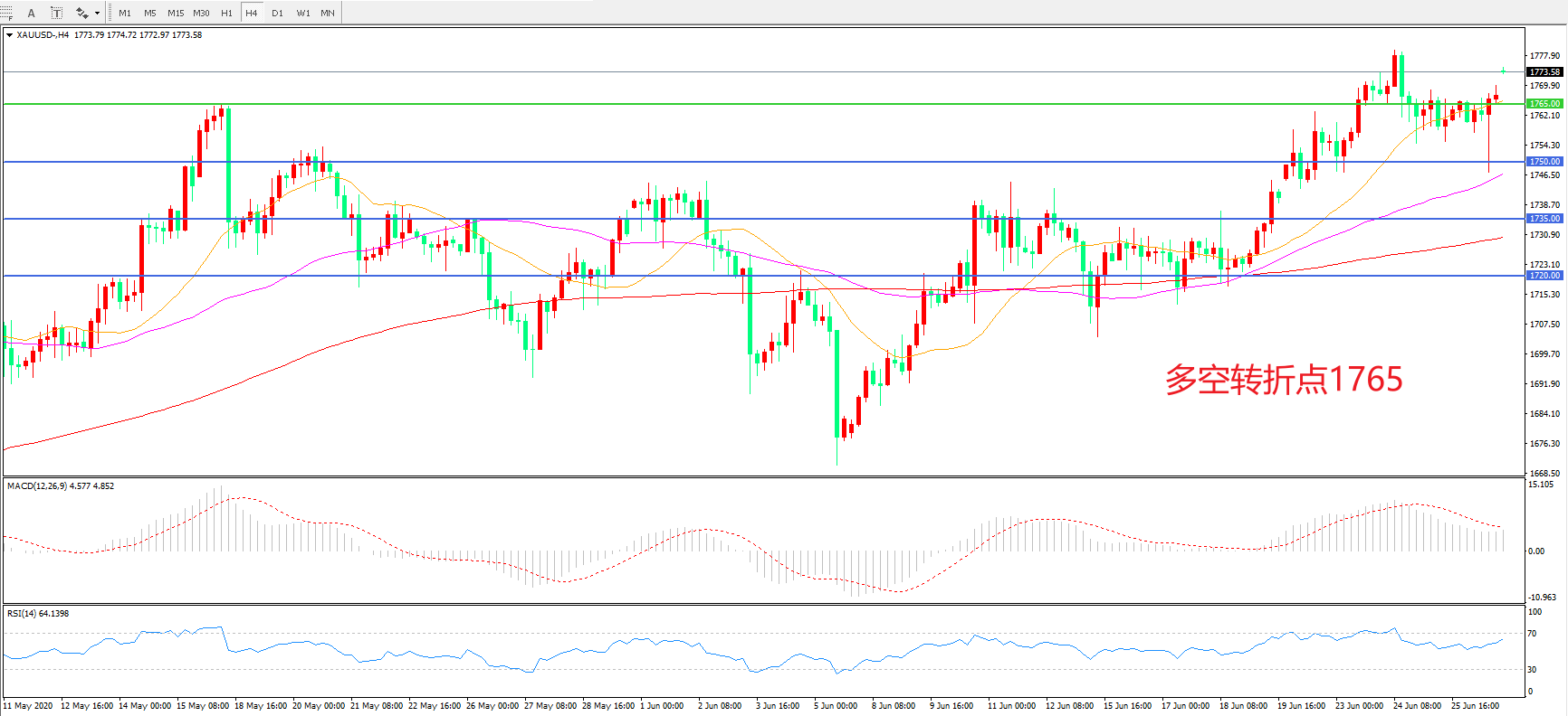 交易策略:在1765.00之上看涨,目标1780.00   1800.00