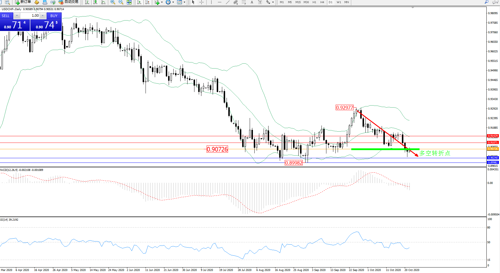 交易策略:0.90726上方看涨,目标0.91071、0.91429