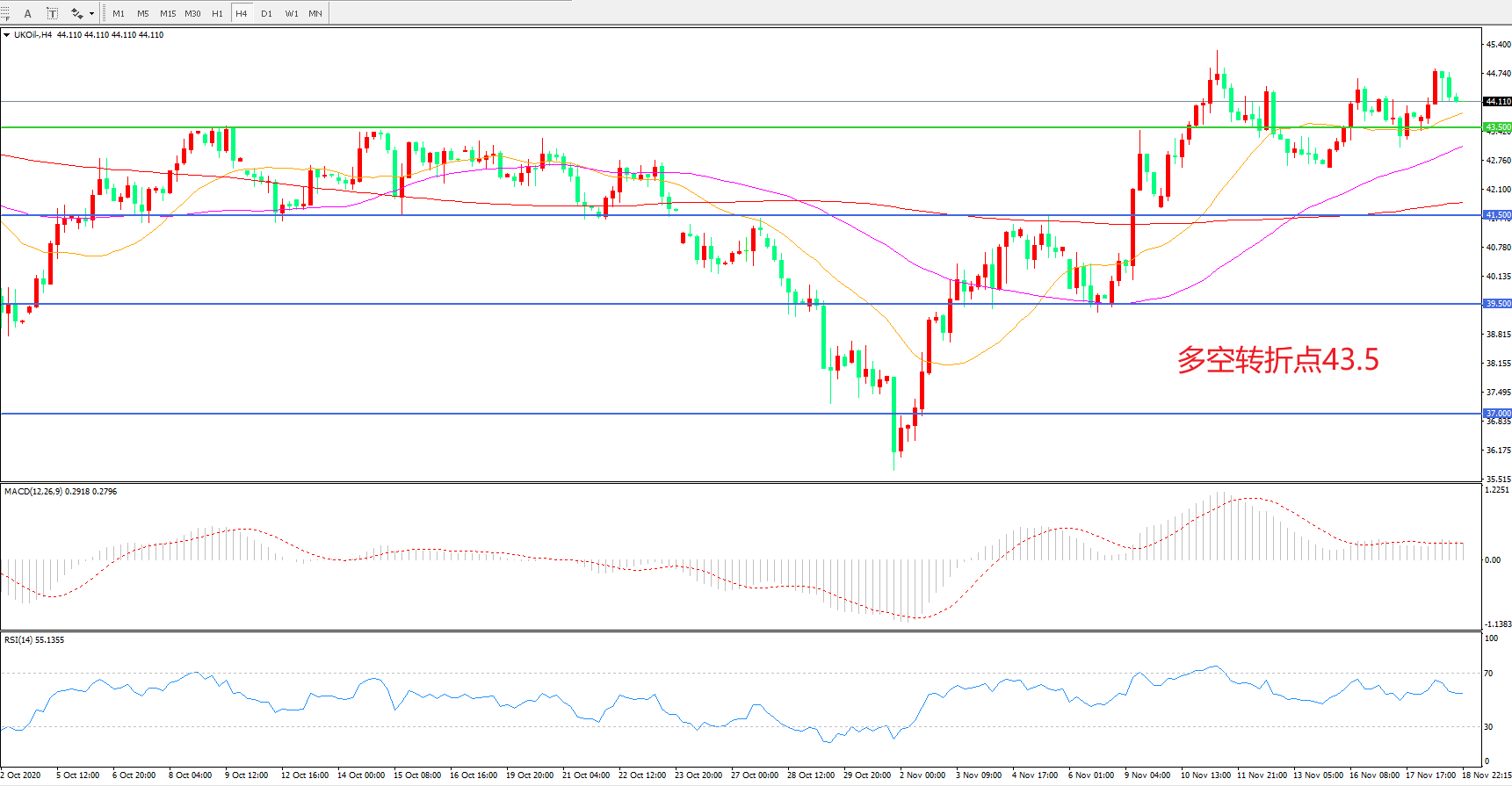 4小时图看,油价在连续震荡后逐渐站稳21周期均线,短期表现有所回暖,43.5成为多空分水岭,MACD红柱增加,RSI指标走平,日内震荡上行概率较大。