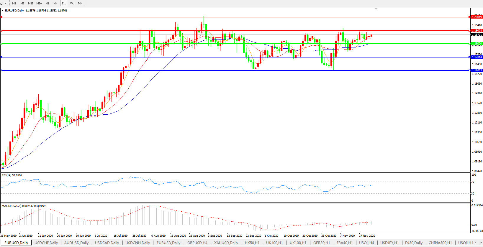 美元指数在周五日内陷于震荡,投资者仍一方面在焦虑不安地关注美国财政援助措施在年底到期后的前景,一方面则又在瞩目辉瑞等公司疫苗紧急提交上市应用申请的前景,同时欧洲与亚太市场还有更多官员对经济及货币政策释放不同的预期,因此汇价在日内出现反复震荡,但波动幅度却仍相对受限; 而业内分析师指出,在消息面陷入拉锯的状况下,美元指数短线横盘波动的趋势还将延续,上周高点93.20仍是当前的强阻力位,而支撑位在日内低点92.30,跌破后可能下踩9月份的低点91.74。在美国大选结果迟迟不明朗,而财政协议也因而悬而未决的大背景下,美元近期确实将难以有效破位反弹。德国商业银行技术分析认为,欧元兑美元将进一步窄幅震荡,在11月高位1.1920下方企稳,但最终料上破此点位,过去三个月一直处于区间整理,为看涨盘整区间的一部分,但尚未看到突破高点的触发点,只要位于六个月支撑线1.1682上方,仍将在其区间内看涨,上行方面,1.1926的阻力位被认为是8月高点1.2014之前的最后防线