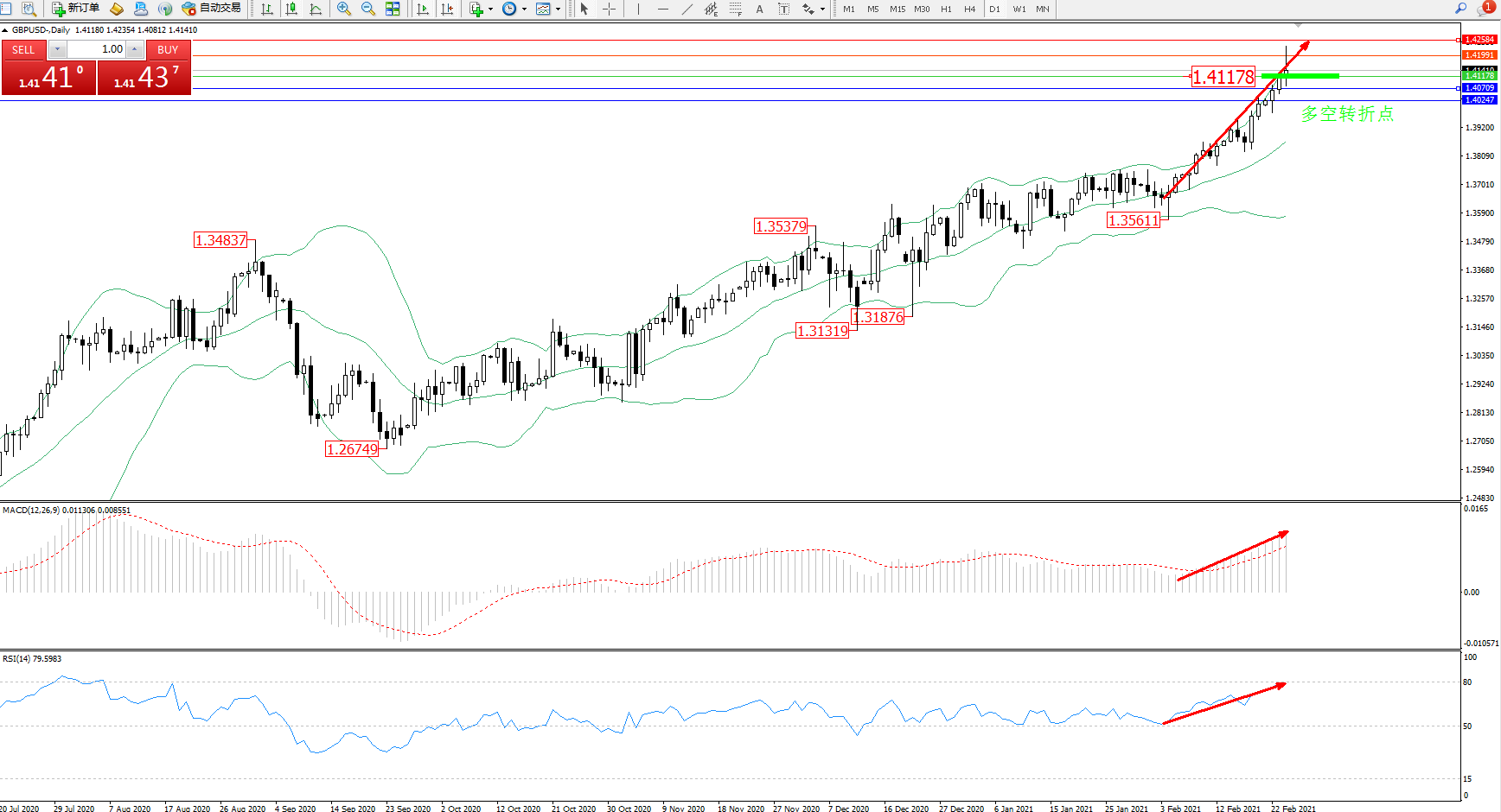 交易策略:1.41178上方看涨,目标1.41991、1.42584