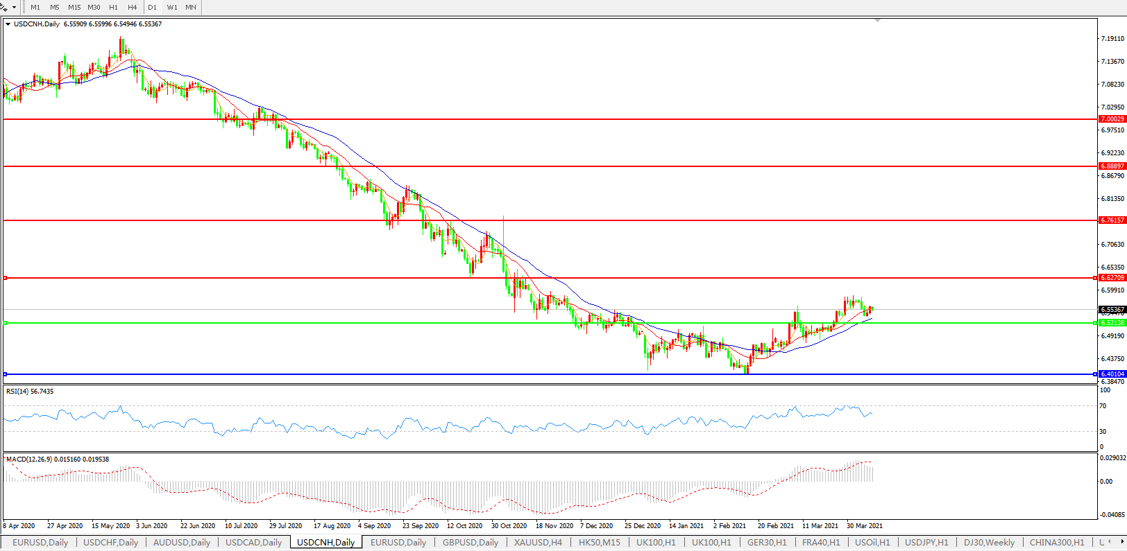 美元兑人民币USDCNH 日线图: