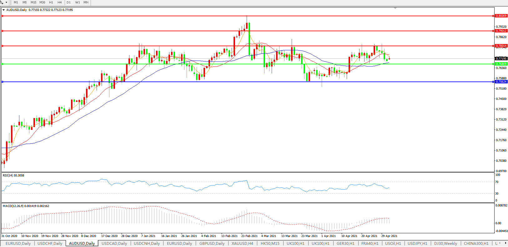交易策略:0.7680上方看涨,目标0.7800、0.7900