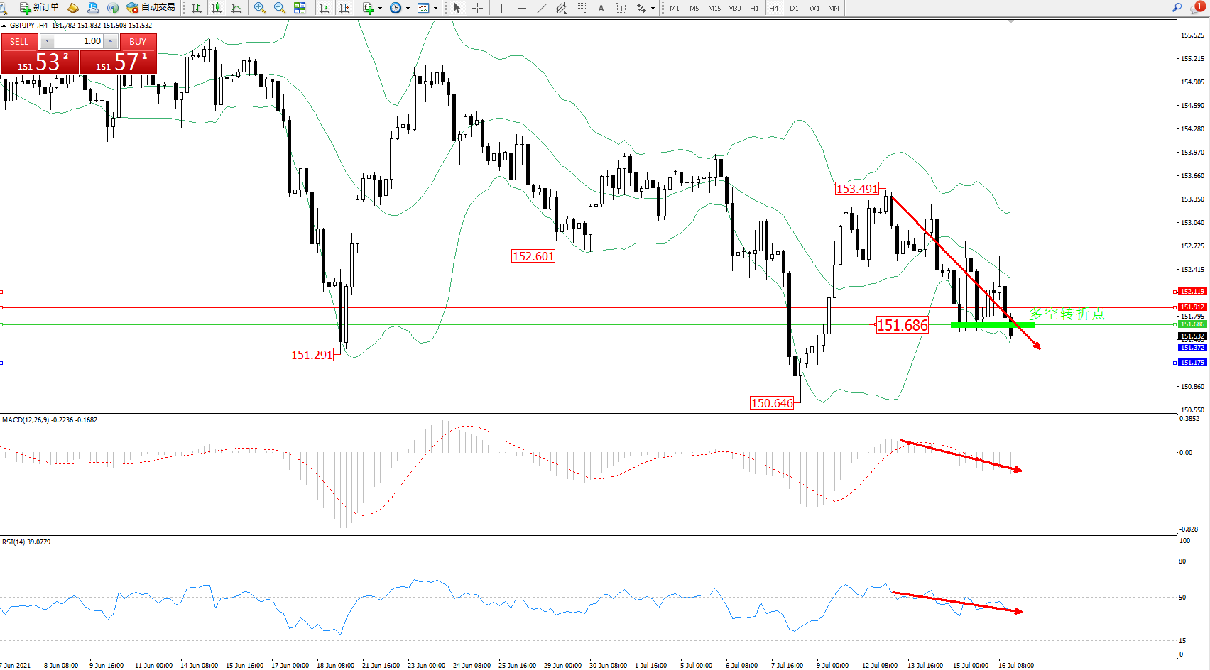 技术点评:高位空头动力延续布林带指标通道中下轨区间持续震荡下行,布林带指标呈下行趋势走势良好,跌势未见止步迹象,前期低位150.646位置近在咫尺,破位在即,MACD指标处于0轴线下方空头区域维持整理平移中,RSI指标处于50均衡线下方弱势徘徊中;