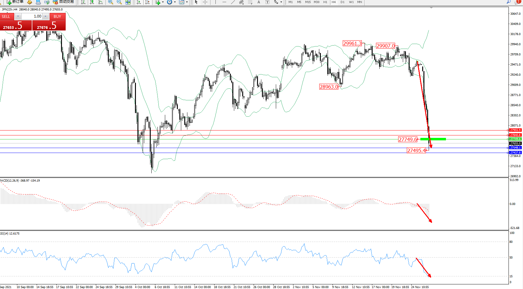 日经225指数11月26日(周五)收盘下跌747.28点,跌幅2.53%,报28752.00点。由于对新型毒株的担忧引发亚洲地区的避险交易,日本股市在亚洲领跌,日元走强。日经225指数跌3%;日本东证指数下跌1.9%,为10月1日以来最大跌幅,所有行业板块均出现亏损。由于新毒株传染性高,对疫苗效力有所影响,各国或许将再次采取限制措施。最近日本新增病例开始减少,疫苗接种率也逐日上升,为世界上免疫水平最高的发达国家之一。而日本政府昨日刚发布月度经济报告称,疫情对经济造成的严峻形势正在逐步缓解,尽管复苏势头疲弱。