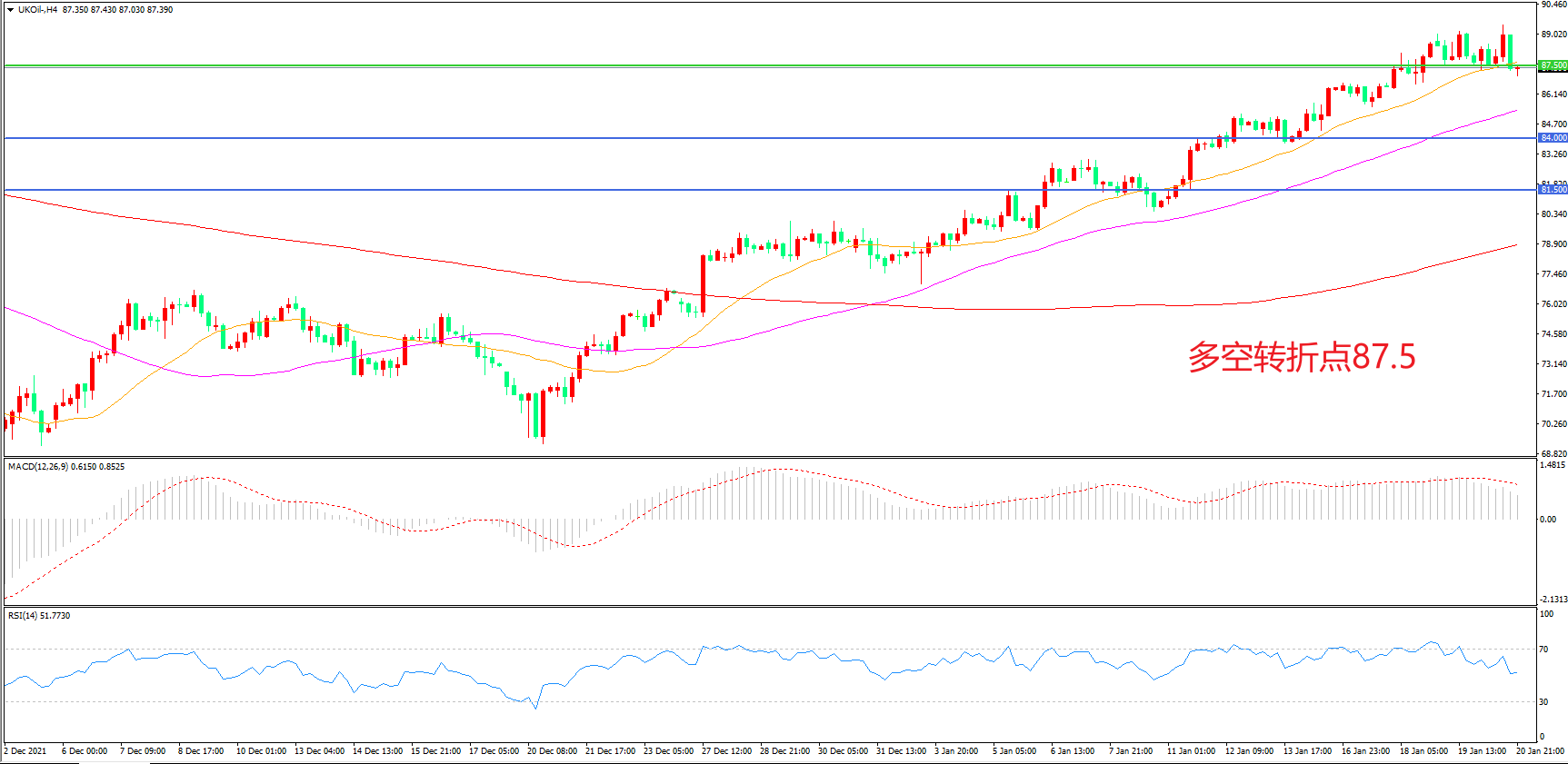 4小时图看,油价连续上行后小幅回落,但上行趋势依然未受到破坏,55周期均线成为下方支撑,87.5美元成为多空分水岭,MACD红柱缩短,RSI指标走平,日内延续震荡概率较大。