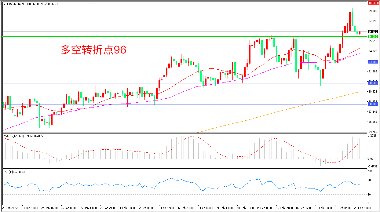4小时图看,油价强势突破96美元一线后再度回落,上行趋势暂缓,但均线系统支撑仍然有效,MACD红柱增加,RSI指标走平,日内震荡上行概率较大。