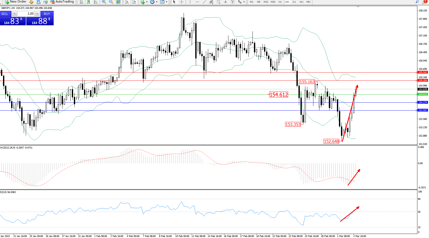 交易策略:154.612上方看涨,目标155.204、155.542