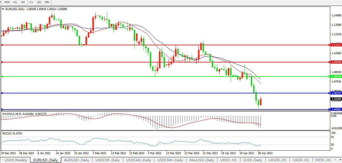 欧元兑美元上涨0.46%至1.0545,双向成交温和,在欧元区公布通胀数据后,欧洲债券收益率走高;欧洲央行首席经济学家Philip Lane称,该地区不会重返低通胀轨道,并对经济增长前景发出警告;欧元4月累计下跌4.6%。