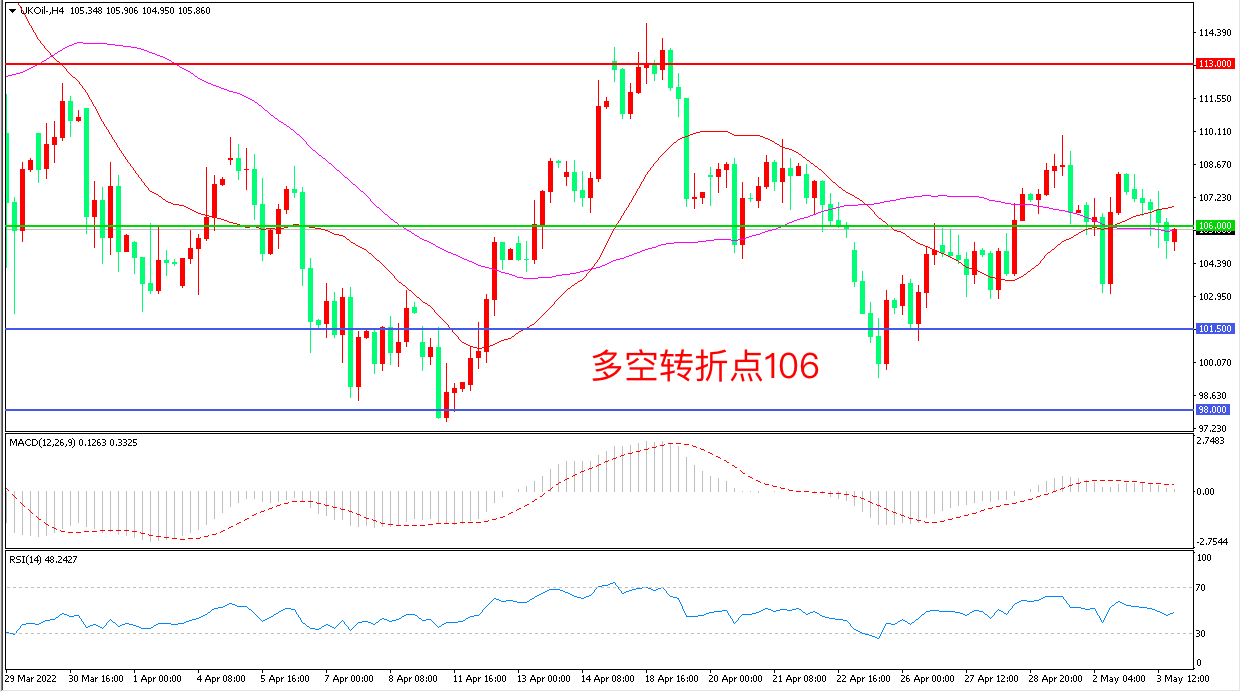 4小时图看,油价短暂冲高后再度回落,横盘迹象明显,106美元成为多空分水岭,MACD红柱缩短,RSI指标走平,日内延续震荡概率较大。