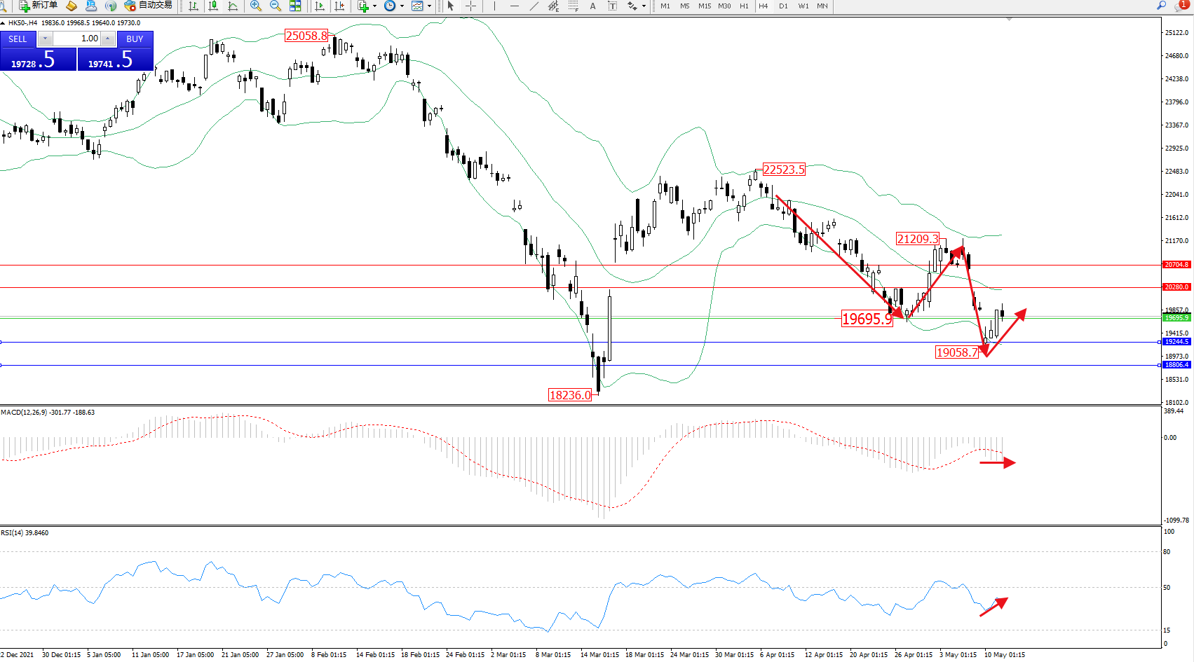 恒指HK50 ——4小时K线图显示: