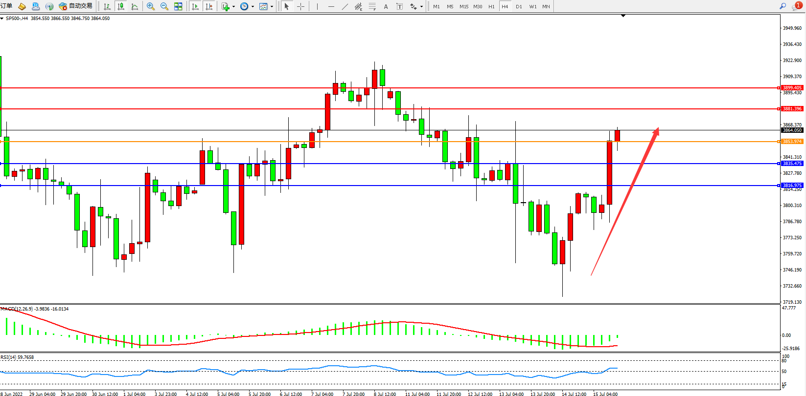 标普SP500——4小时K线图显示