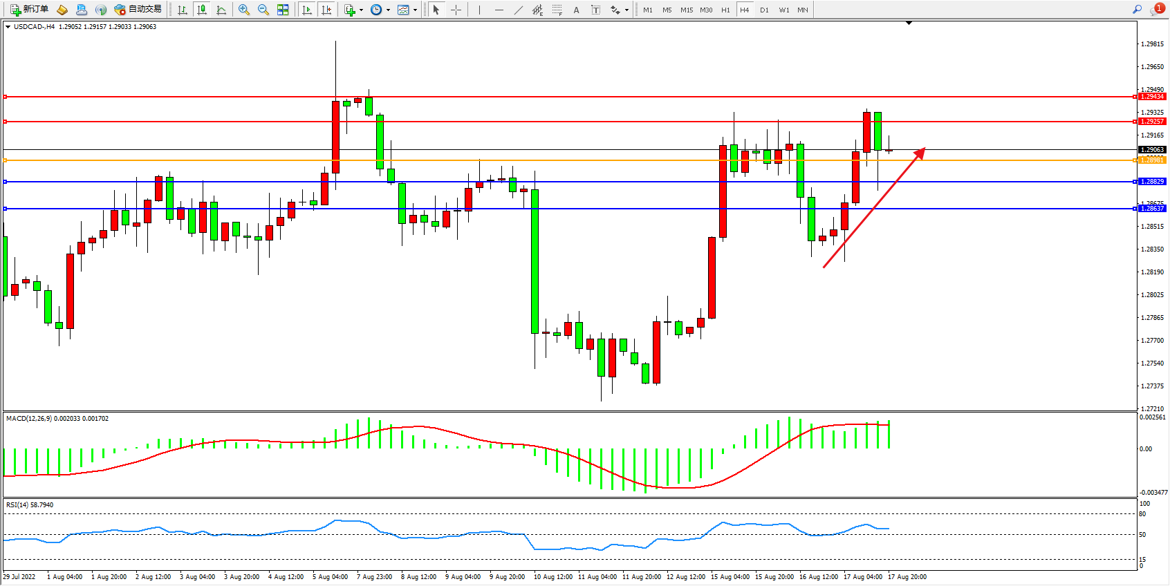 美元加元USDCAD——4小时K线图显示: