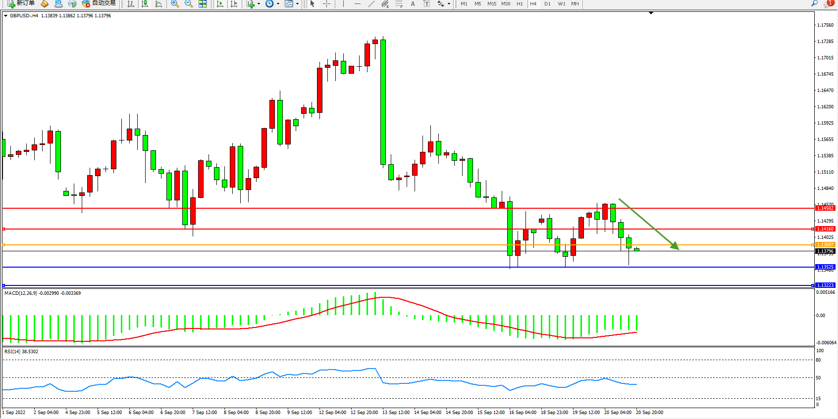 备选策略:1.13897上方看涨,目标1.14160、1.14502