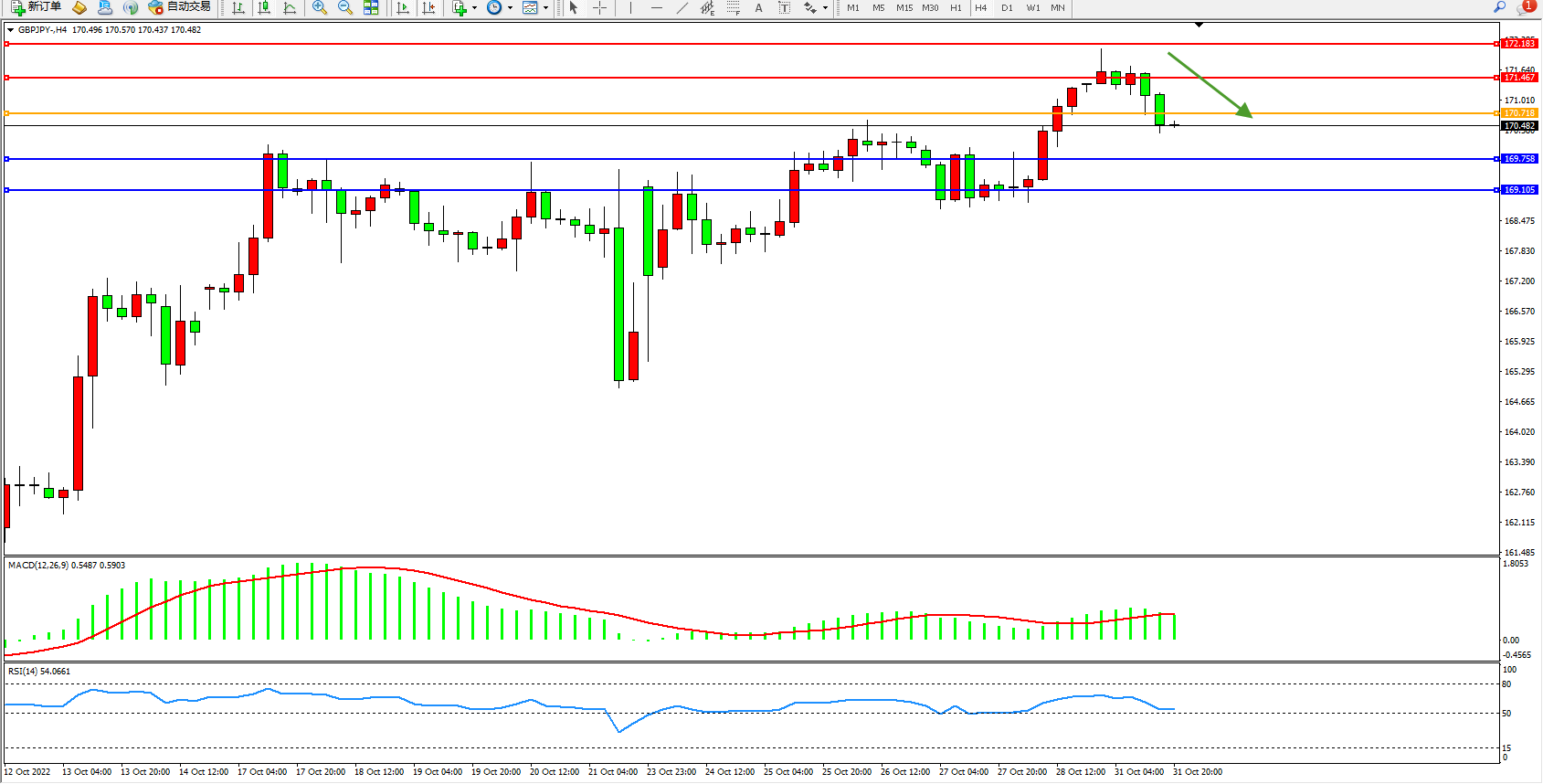 交易策略:170.718下方看跌,目标169.758、169.105
