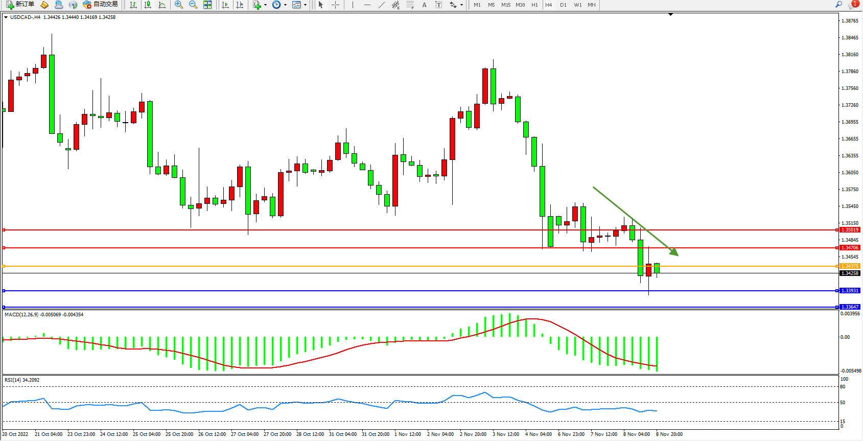 美元加元USDCAD——4小时K线图显示: