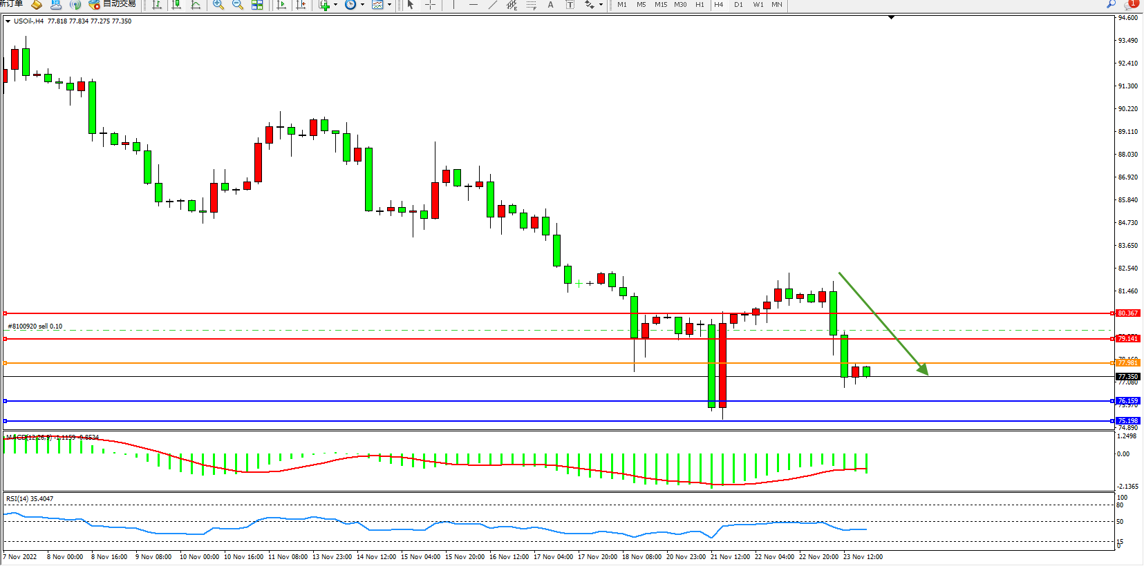 交易策略:77.981下方看跌,目标76.159、75.198