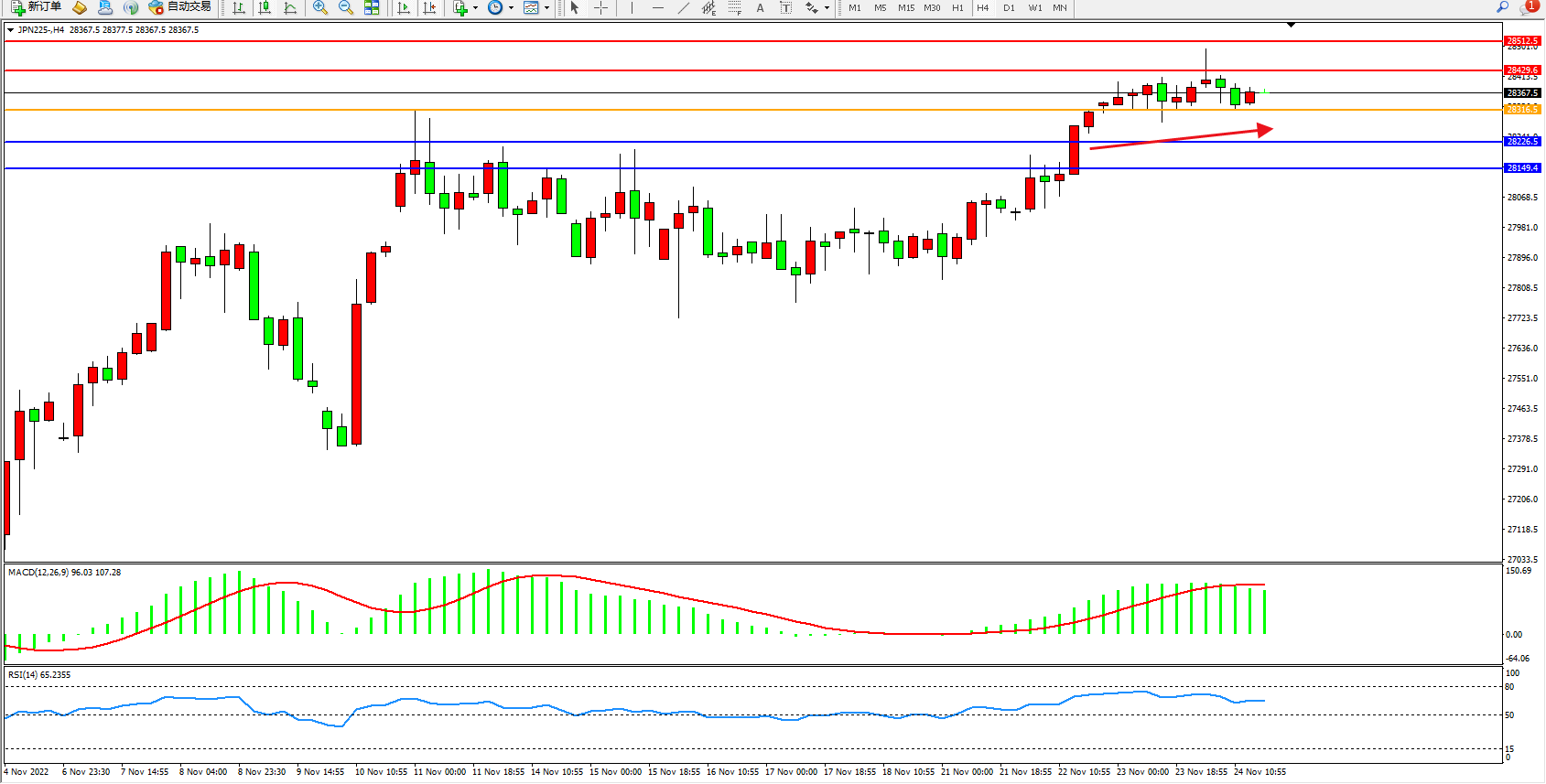 4小时图看:高位多头动力缓慢上行,市场看涨情绪笼罩,短期有继续向上移动态势,MACD指标处于多头区域缓慢上移,RSI指标处于多头区域高位整理;